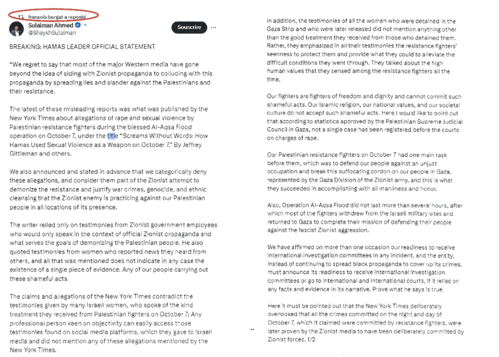 Ainsi par exemple, le 1er janvier 2024, Monsieur François BURGAT a reposté sur son compte Twitter un communiqué officiel publié la veille par le groupe terroriste Hamas pour dénoncer une « tentative sioniste de diaboliser la résistance et de justifier les crimes de guerre, le génocide et le nettoyage ethnique », et qui affirmait notamment : « Nos combattants de la résistance palestinienne du 7 octobre avaient une tâche principale à accomplir : défendre notre peuple contre une occupation injuste et briser ce cordon étouffant sur notre peuple à Gaza, représenté par la division de Gaza de l’armée sioniste, et c’est ce qu’ils ont réussi à accomplir avec toute la virilité et l’honneur qu’on leur connaît. »